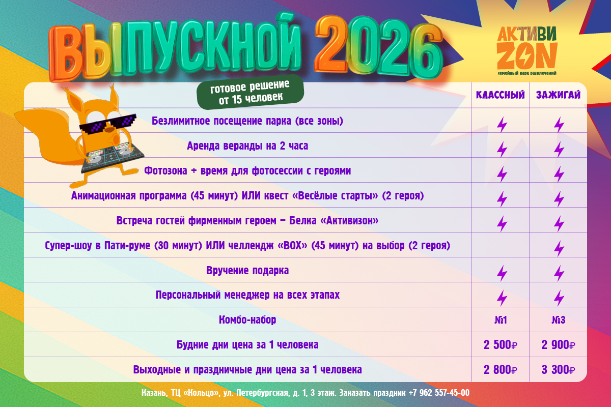 - Анимационная программа (45 минут) или квест «Веселые старты» (2 героя)